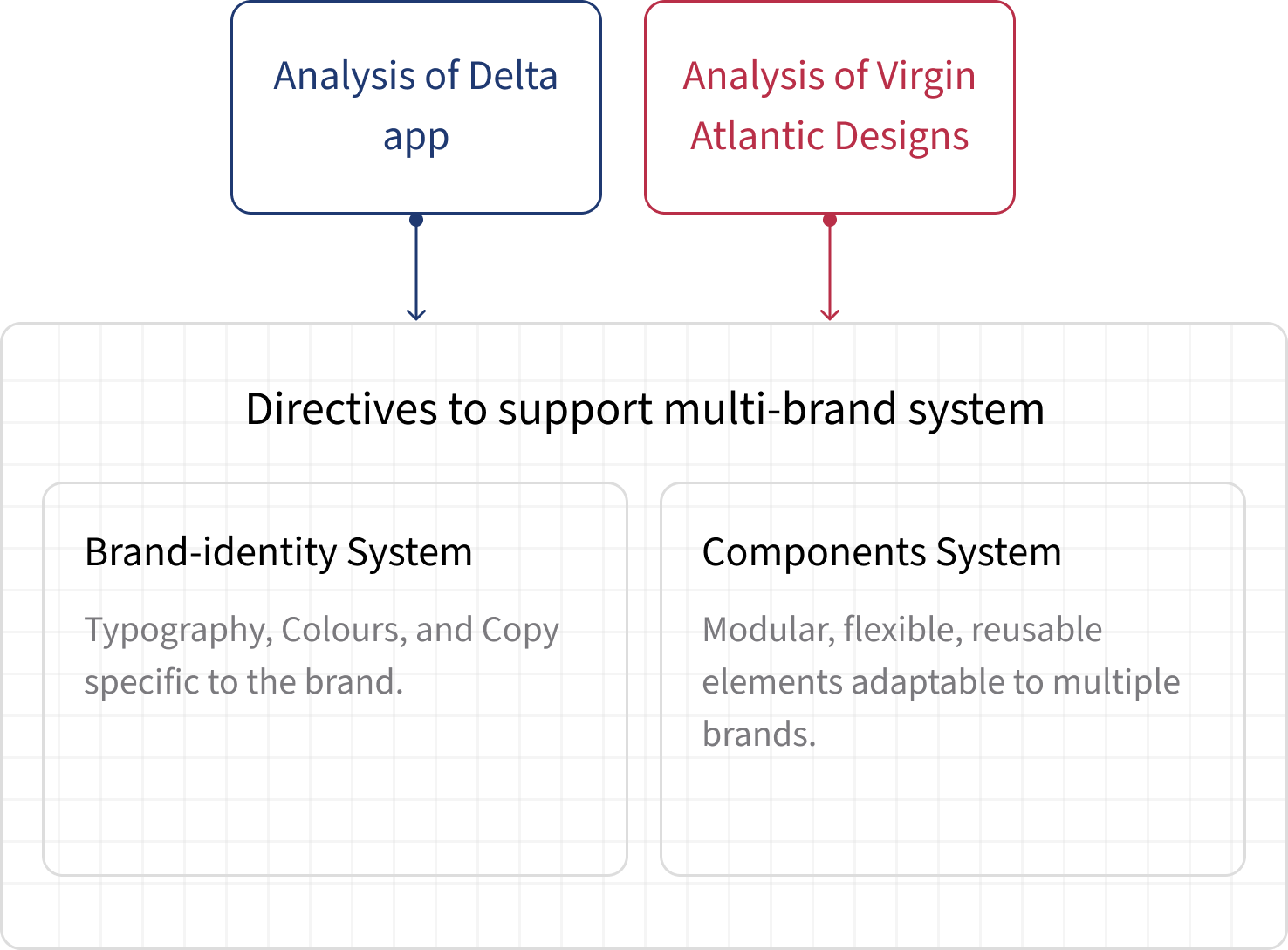 We developed a multi-brand system by analysing the Delta app and Virgin Atlantic designs. The strategy included a Brand-Identity System for unique typography, colours, and copy, and a Components System for modular, reusable design elements adaptable across brands. This approach ensured cohesive yet distinct branding.