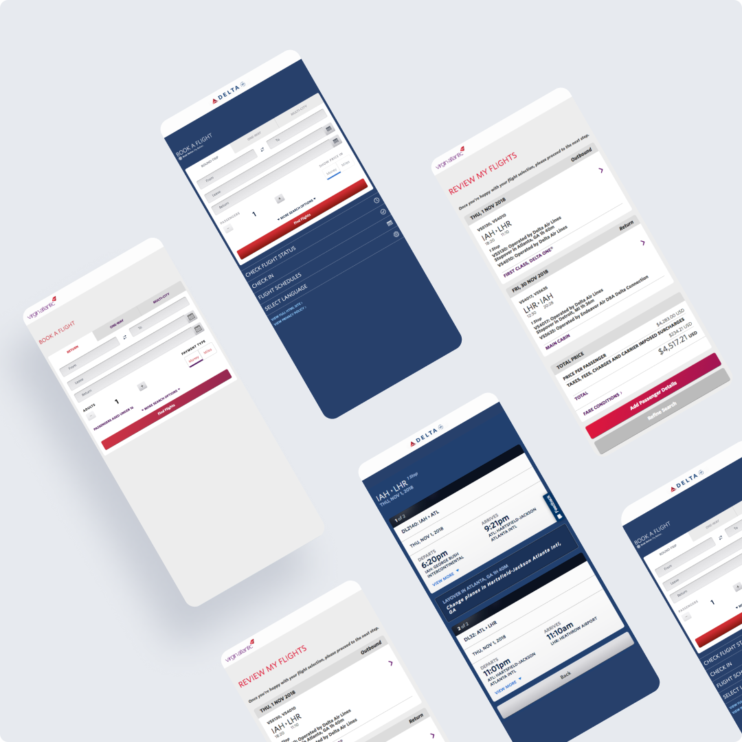 There were no comprehensive guidelines. An external design agency supplied a few rebranded screens incorporating Virgin Atlantic’s brand guidelines into the Delta app, leaving us unsure how to translate them across three teams (iOS, Android, and Mobile Web) in different time zones (Atlanta, London, and Gurgaon). While primarily working as a UI developer, I also assumed design responsibilities.