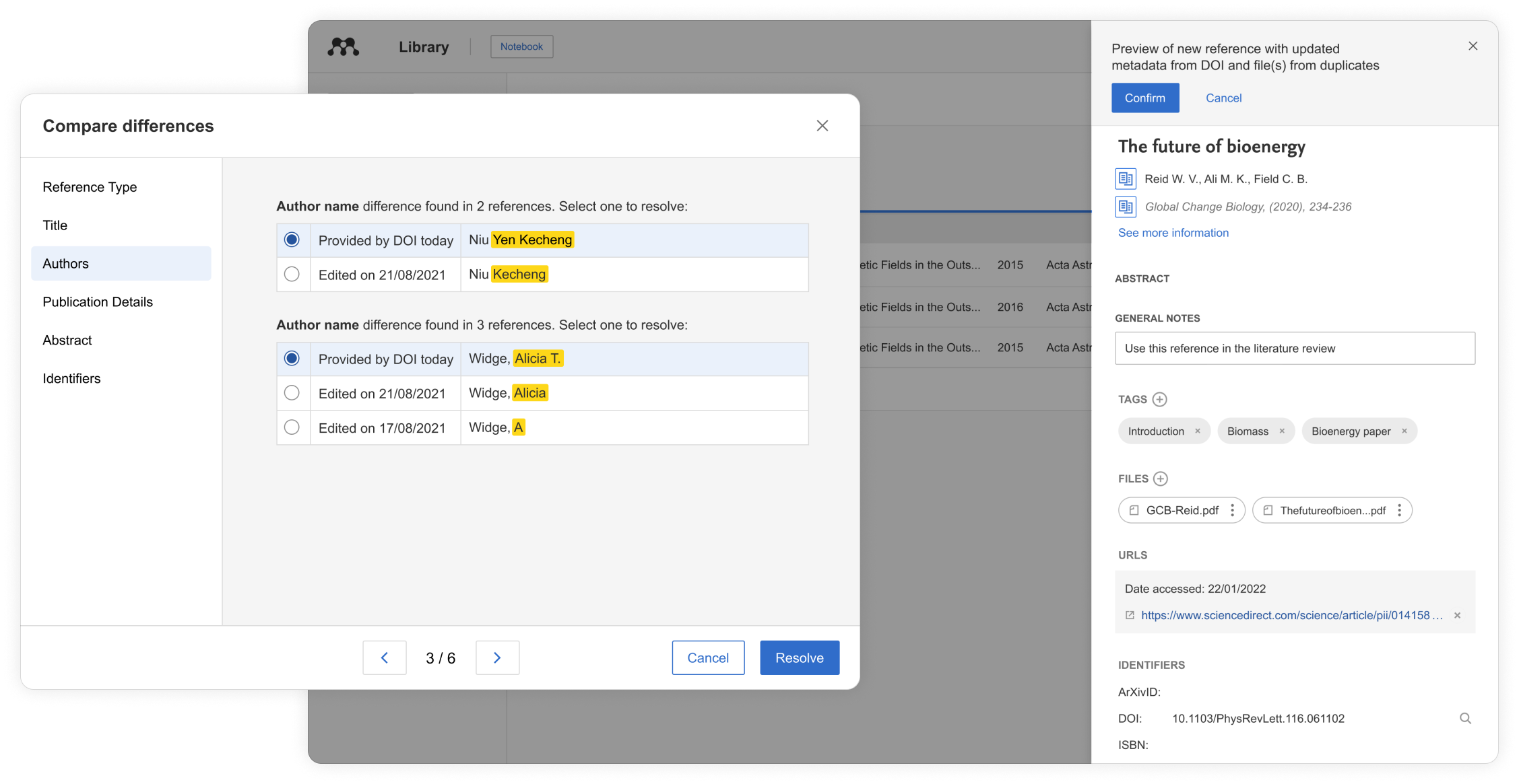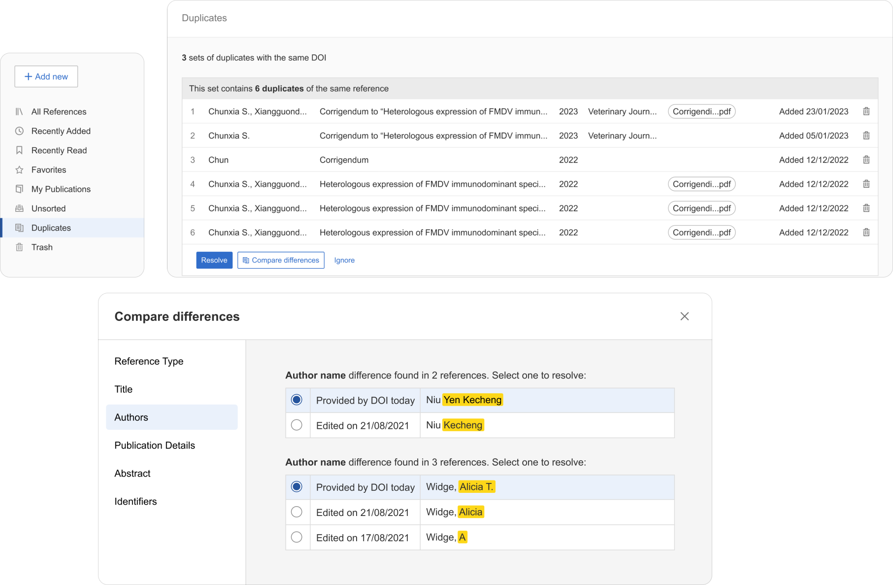 Aiming to elevate the quality of researchers' work, Mendeley's Duplicate Management feature effortlessly identifies, compares, and resolves duplicate references, ensuring a streamlined and efficient research process for all users.