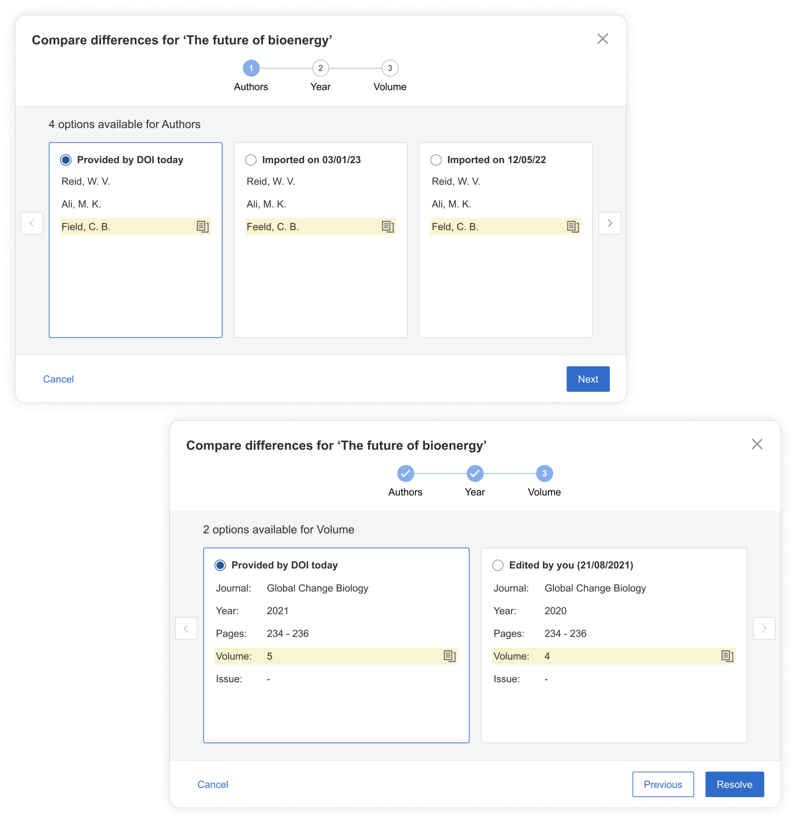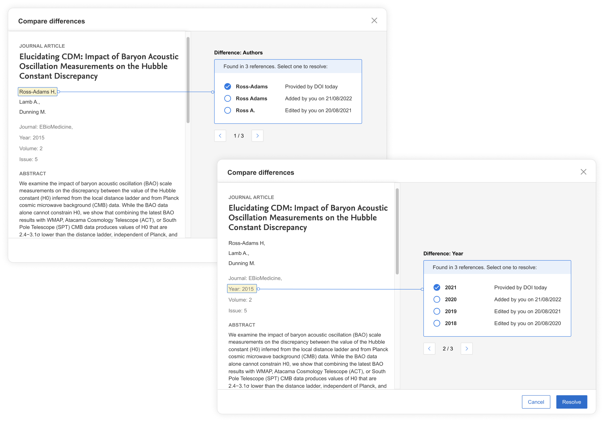 After user testing and cross-disciplinary feedback, I designed a solution that prioritises usability and scalability. The new approach handles any volume of duplicate metadata, offering clear navigation and a streamlined process for comparing, selecting, and resolving duplicates. It enables users to easily identify discrepancies and move seamlessly through the comparison process.